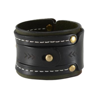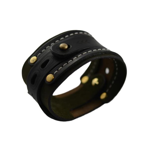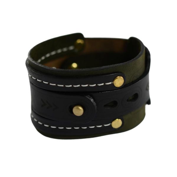 This Dual lock leather bracelet is handcrafted from two different types of leather that interlock as it closes. The top piece is smooth and firm while the bottom piece is soft and comfortable for the forearm. The seam ends of this bracelet are secured with brass rivets.The size of the bracelet can be adjusted with dual-stud buttons. Handmade in the USA, from American leather