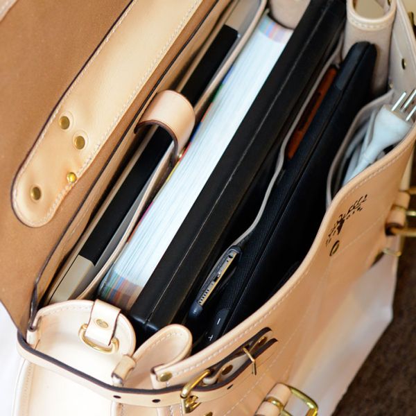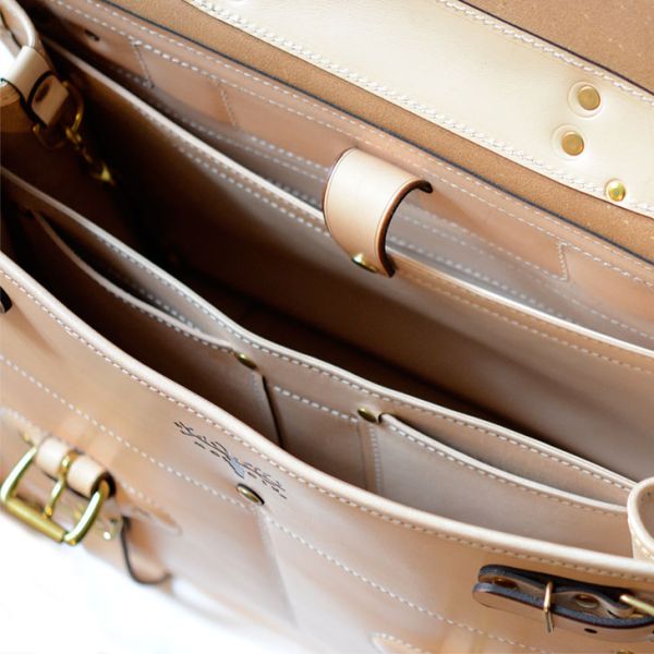 This second-edition Business briefcase is handcrafted from a full-grain, top-quality Saddle leather and is designed to last for generations. It is assembled with solid cast brass hardware and stitched with heavy-duty polyester thread. The inside of the Business briefcase has two large, expandable main compartments. It also has a laptop pocket in the back, along with 4 small pockets for accessories. The outside exterior of the briefcase has a large easy-access pocket on the back. All of the stress points and seam ends are reinforced with industrial-duty rivets. The briefcase comes with a wider and heavy-duty adjustable shoulder strap. The design of this second edition briefcase is extremely functional and practical: it can expand and contract based on your needs. It is the perfect everyday carry for the modern traveler. Handmade in the USA, from American leather. MADE TO ORDER (up to three weeks time)