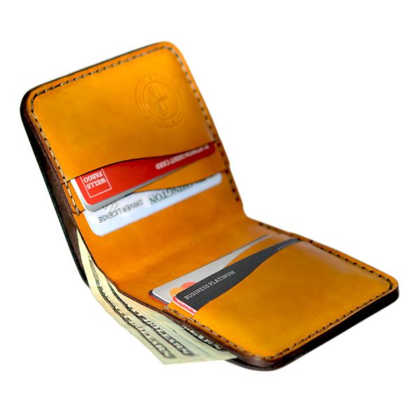PRODUCT FEATURES: • One large section for cash • Four card slots • Slim, convex bill holder design • Comfortable for hand and pocket use • Hand sewn with waxed thread