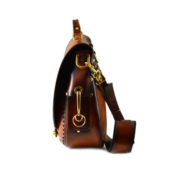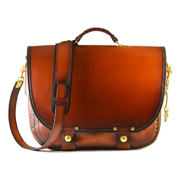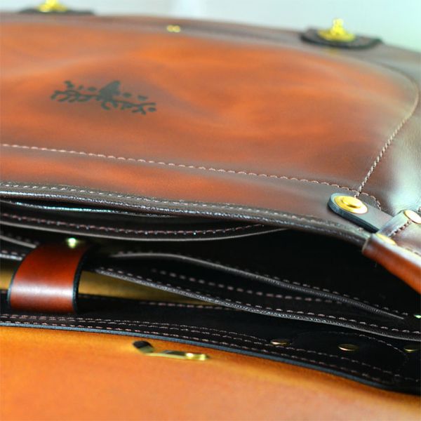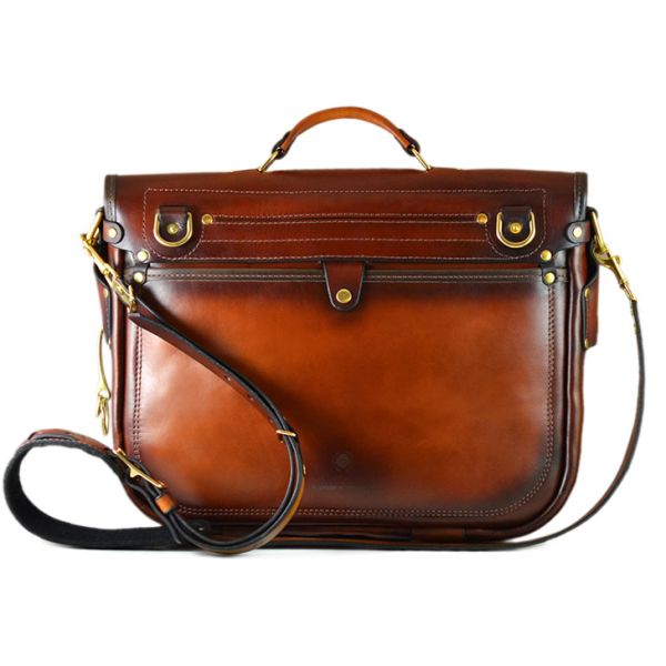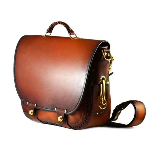 This functional, sleek, and cosmopolitan Companion Messenger bag is the quintessential everyday carry for the modern commuter. The distinct braided design is not only aesthetically pleasing but also helps transition the smooth and aerodynamic form of the bag while also evenly distributing the weight. The leather we use in the Companion Messenger exterior and interior is made from the highest quality full-grain American leather that is both supple and smooth while offering superior comfort. All of the hardware used in the bag is solid cast brass. The bag is stitched with heavy-duty polyester thread and has stress points reinforced with industrial-grade brass rivets. The front flap of the Companion Messenger has twin lock closures with easy on and easy off release actions. However, the lock closures can also resist a pullout force of up to 220 pounds, allowing you to securely close your bag while also enabling you to open and close easily with your fingertips. The back of the bag has a large quick-access pocket with a snap closure. The Companion Messenger is highly adaptable and can quickly change between multiple modes of carry. The bag can be used in its crossbody mode, where the form of the bag allows it to comfortably wrap and mold around your waist and hip. The adjustable shoulder straps can also be shortened, slid through the side, and locked together at the bottom of the bag to convert into its shoulder mode. In the shoulder mode, the bag can be comfortably worn either across the back or on a single shoulder. The comfortable design of the bag and its slight crescent shape allow it to cusp across your back or side. The Companion Messenger has an ergonomic grip on the top of the bag, designed to accommodate all types of hands. The inside of the messenger is roomy and efficient, with three main compartments. The back compartment has one large pocket that is designed to carry large electronics such as laptops, tablets, and notebooks in secure snap closure, with an additional two smaller pockets for holding daily use gadgets. The spacious middle compartment can hold bulky daily carry items and has an eyeglass holder and pen holder on the sides. The front compartment has one large pocket that can hold documents, magazines, folders, and another slightly smaller pocket to hold other items. The companion messenger bag also comes with a detachable exterior key ring holder, perfect for accessing everyday use household keys. This bag is designed to be a hassle-free, everyday carry companion for the modern commuter. Handmade in the USA, from American leather. MADE TO ORDER (up to three weeks time)