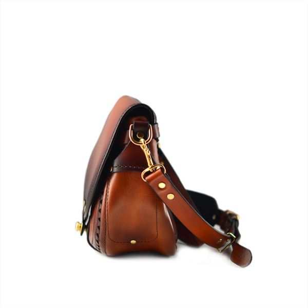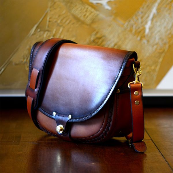 This unique and smaller version of the Companion Crossbody bag is designed to be the everyday carry essential for the modern women on the go. The distinct braided design is not only aesthetically pleasing but also helps transition the form of the bag. The Leather we use in the Companion Crossbody is made from the highest quality full grain American leather that is both supple and smooth while offering superior comfort. All of the hardware used in the bag is solid cast brass. The bag is stitched with heavy duty polyester thread and has stress points reinforced with solid brass rivets. The front flap of the cross body bag has a lock closure with an easy on and easy off release action, yet can resist a pullout force of up to 220 pounds, allowing you to securely close your bag while also enabling you to open it quickly with your fingertips. The back of the bag has a large quick access pocket. The Companion Crossbody bag is highly adaptable and can quickly change between two different modes of carry. The bag can be used in its crossbody mode, where the form of the bag allows it to comfortably wrap around your body. The adjustable shoulder straps can also be shortened and locked together around the bottom of the bag to convert into its shoulder mode. In the shoulder mode the bag can be comfortably worn on a single shoulder. The inside of the bag is roomy and efficient, with three main compartments, two small pockets, an eyeglass holder and even a pen holder on the side. The back compartment is designed to carry electronics in a secure snap closure, while the spacious middle compartment can hold daily carry items. The smaller front compartment can also hold additional gadgets cosmetics and accessories. This bag is designed to be a hassle free, every day carry companion for the modern day woman. Handmade in the USA, from American leather. MADE TO ORDER (up to three weeks time)