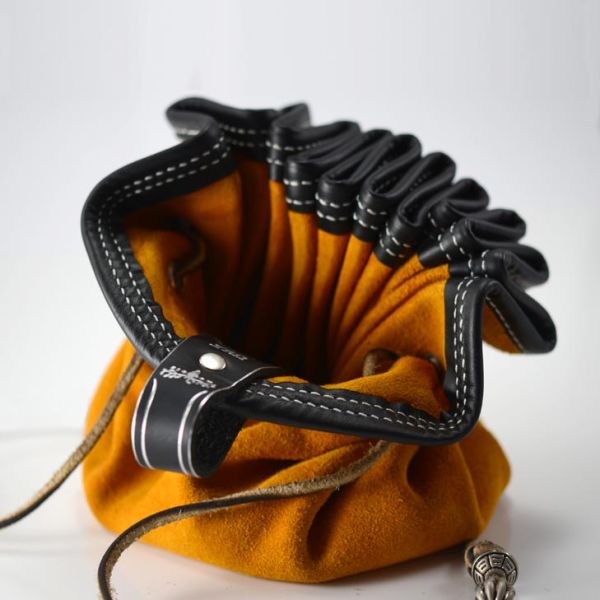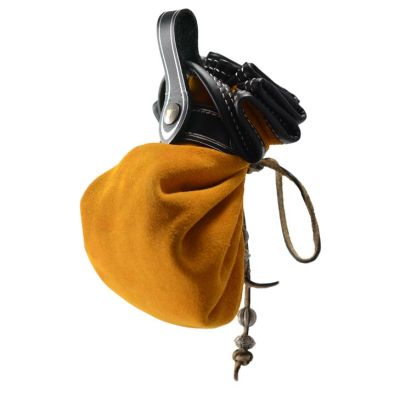 This Dingo pouch is made from a single piece of gorgeous suede and has a leather drawstring that wraps around and ties the edges together. The pouch is great for carrying or storing your valuables. The handle of the piece fits perfectly around your fingers or in a belt. It has a unique accordion style opening with dark leather trimming. The drawstring securely conceals the pouch. Handmade in the USA, from American leather