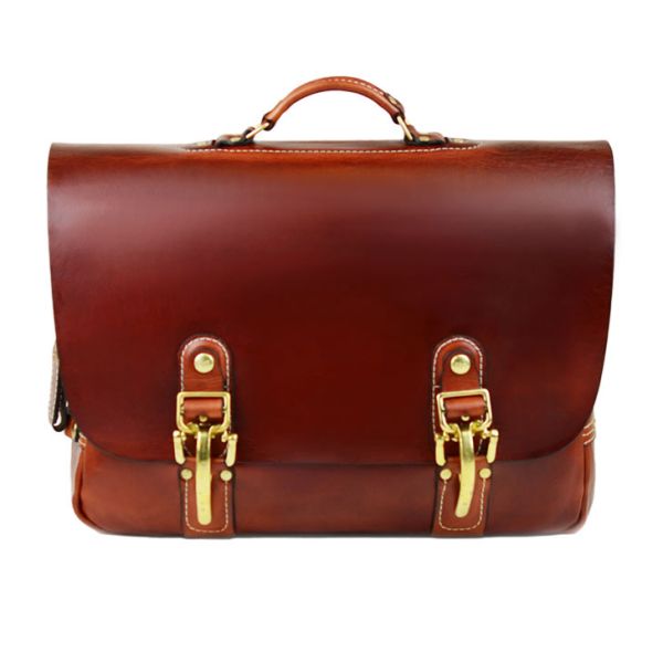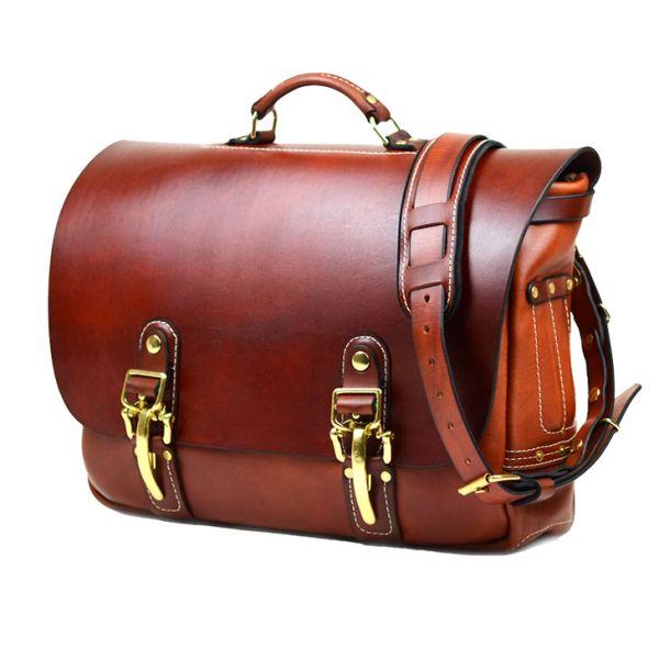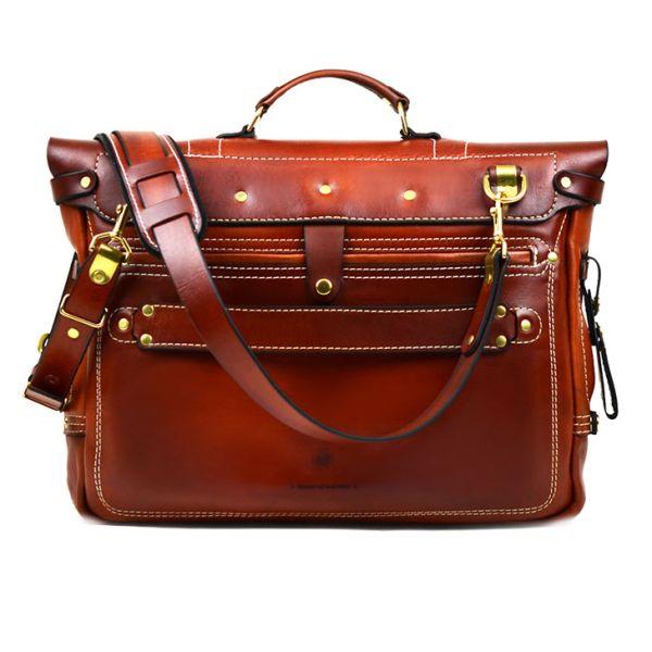 This highly functional and practical bag is the 2nd generation of our Heirloom Messenger. The leather we use in the Heirloom Messenger 2 is made from top-grade vegetable-tanned full-grain saddle leather that is hand-dyed and oiled. The bag is stitched with a heavy-duty polyester thread- and all of the hardware we use on it is solid cast brass. All the stress points are riveted with industrial-grade solid brass rivets. The front flap of the bag has 2 heavy-duty brass opening and closing latch locks that allow ease of access while also adding to the premium look. They allow you to both secure and close the bag with one hand. There is also a detachable tag holder that can hold a custom engraved brass nametag on the side of the bag. The back of the bag has a large quick-access pocket with a snap closure for quick access. This convenient pocket is perfect for carrying newspapers or passports and traveling documents. There is also a built-in luggage strap. The new shoulder strap has been upgraded with a wider adjustable shoulder pad and all stress points have been reinforced. The Heirloom Messenger 2 now sports a handle at the very top of the bag with a reinforced base and support structure. The inside of the bag is roomy and efficient. The bottom of the inside has built-in leather padding to protect your goods. There are two large dividers with the back laptop compartment, while the front can hold your documents and folders. There is also a large middle compartment for books and other larger gear. Three small pockets inside the bag can hold chargers, wallets, and other small items. On the sides, there are two enlarged pencil pockets, a key leash, and an eyeglass holder. The Heirloom Messenger 2 crosses the divide from the Postal man to the modern businessman - with enough room and class to hold all of his gear. Handmade in the USA, from American leather. MADE TO ORDER (up to three weeks)
