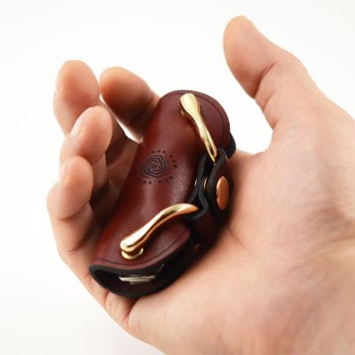 This compact key holder is designed from high quality vegetable tanned saddle leather that is hand dyed and edge burnished. The unique design of the key holder is comfortable for the palm of your hand but is small enough to fit into any pocket. The key holder holds up to 10 common household keys. The hardware used on this product consists of an industrial strength snap, rivet, and cast D ring. This all insures the product’s longevity. Handmade in the USA, from American leather.