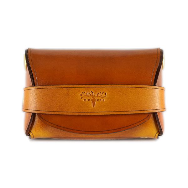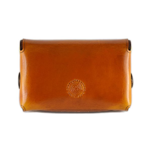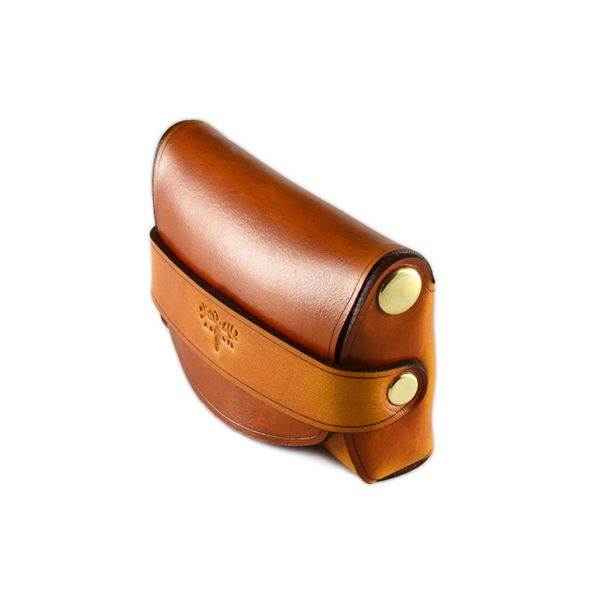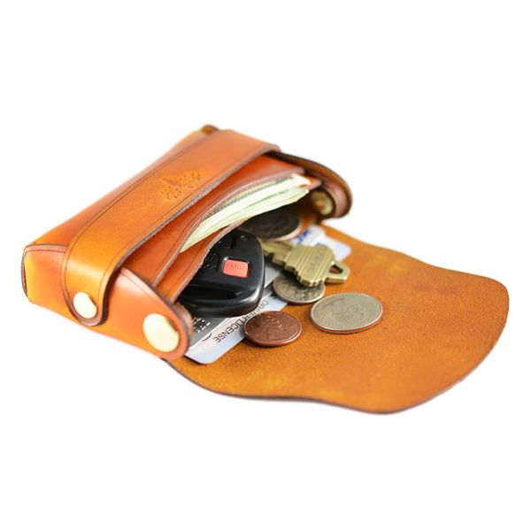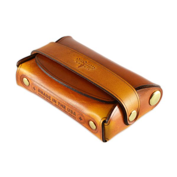 This Palm wallet is stitch-less and made from a single piece of high quality saddle leather that is thick, firm, and durable. The palm wallet is comfortable in the hand and has brass rivets that support the wallet. It incorporates a minimalist look along with a modern style because of its unique form. The palm wallet holds a variety of cards and has 3 compartments inside of it. It has enough space for coins, cash, and even keys. Handmade in the USA, from American leather