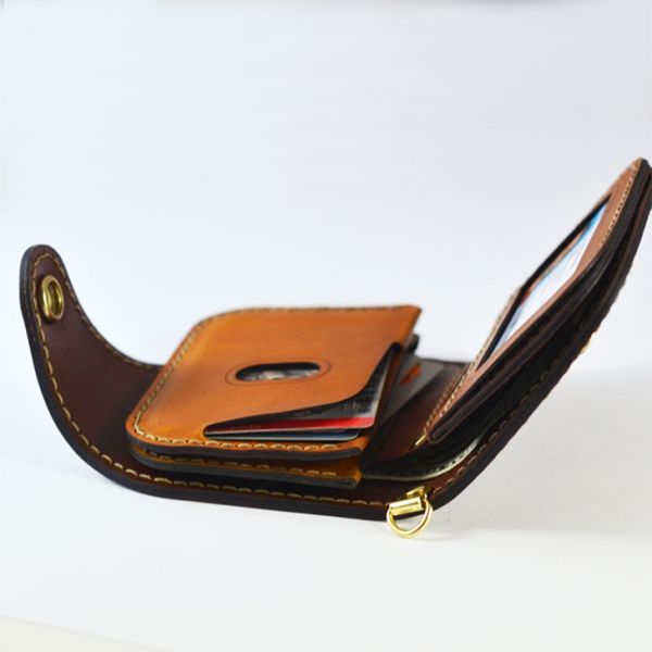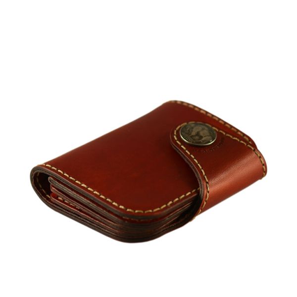 PRODUCT FEATURES: • Large sections for cash • Three card slots • ID slot • Locking snap • Hand sewn with waxed thread